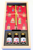 Ce beau coffret en pin naturel marqué à chaud est fabriqué par la Société Herbin et présente un porte-plume doré à griffes, de forme ancienne, une plume d'écriture Cito Fein, trois flacons d'encre de 10 ml "Gris Nuage", "Rouge Caroubier" et "Eclat de Saphir" et un bloc de papier d'écriture.